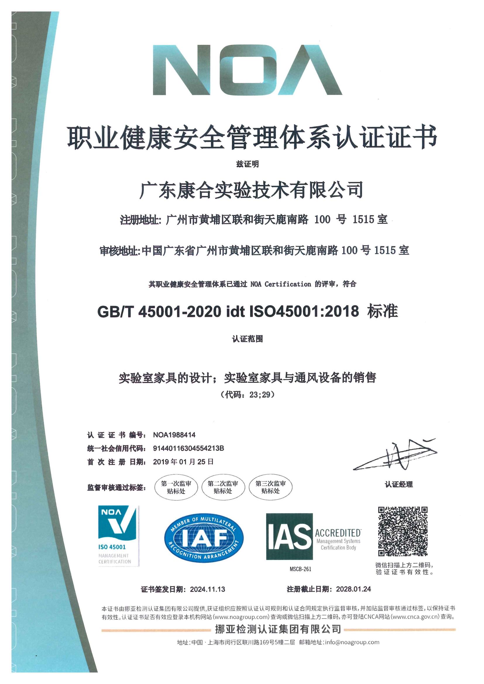 康合憑借雄厚的實驗室設計實力、規范的實驗室施工流程以及優良的服務質量,通過了ISO9001:2015質量管理體系、ISO14001:2015環境管理體系、BS OHSAS18001:2007職業健康安全管理體系等多項國際體系認證,擁有多項實驗室裝備行業的專利技術。